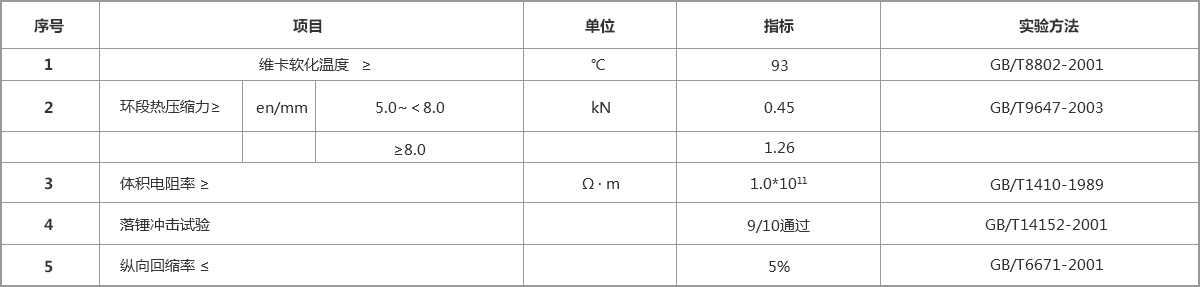 PVC-C樹脂為母料,該產品具有強度高、柔韌性好、耐高溫、耐腐蝕、阻燃、絕綠性能良好、不易老化、質輕、施工方便等特點,其各項性能指標經國家級、省檢測、鑒定和認證,均已達到或超過國內的同類產品水平。產品性能大優于傳統的石棉電纜排管及普通PVC管材,是傳統電力電纜護套管的理想替代品。